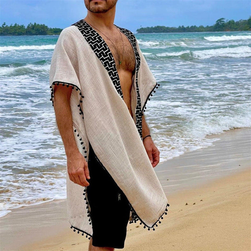 2022 Summer Cotton Linen Short Sleeve Shirt Solid Color Collarless Men's T-Shirt