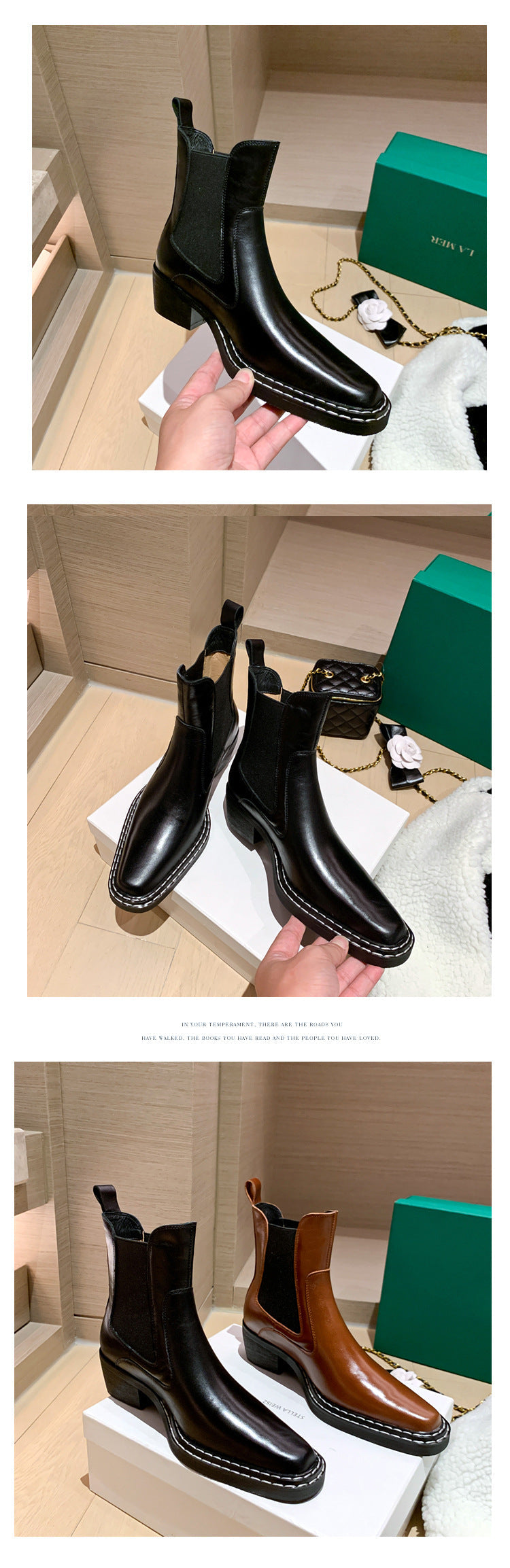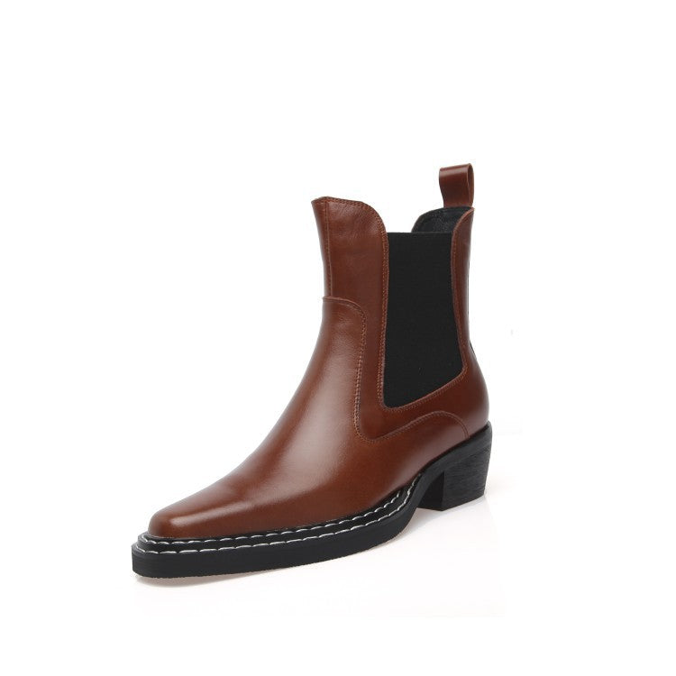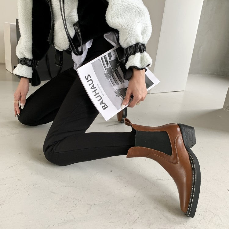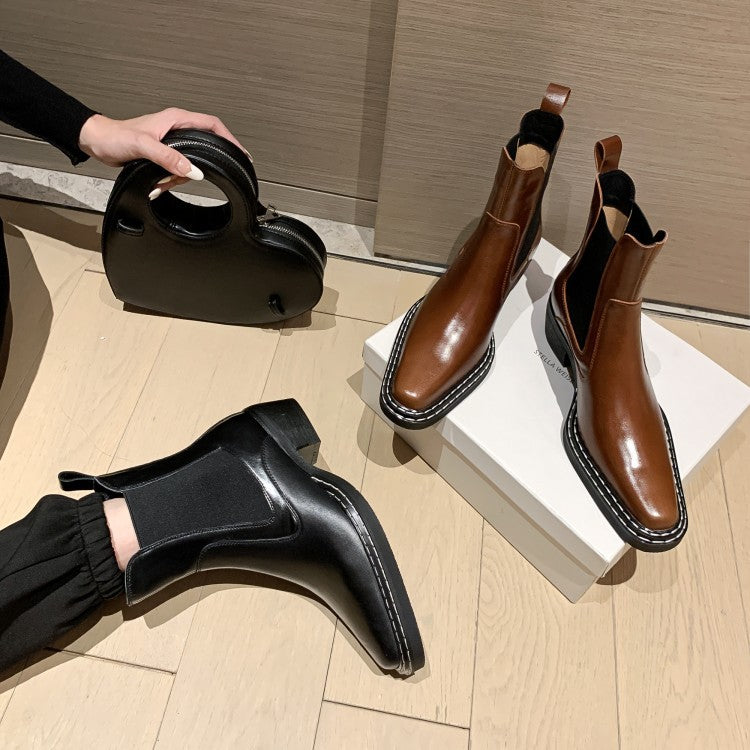 Vintage chunky heel women's short boots small square toe Chelsea boots mid heel